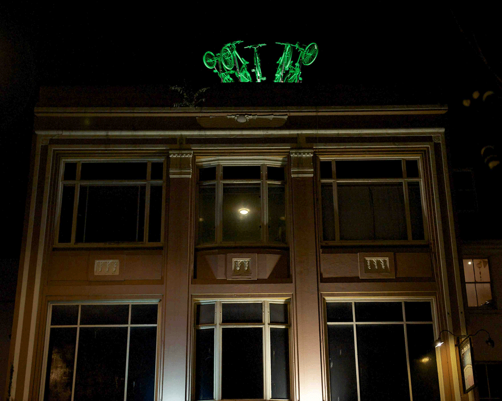The reCyculture team created an epic installation on the roof of the World’s End pub – Night Bikes – as part of SHINE On London Road. The installation was commissioned by Brighton & Hove City Council and Portas Pilot regeneration scheme as alternative Xmas lights and was in place December 2013 to January 2014, surviving the festive season’s storms and 90mph gale force winds.
